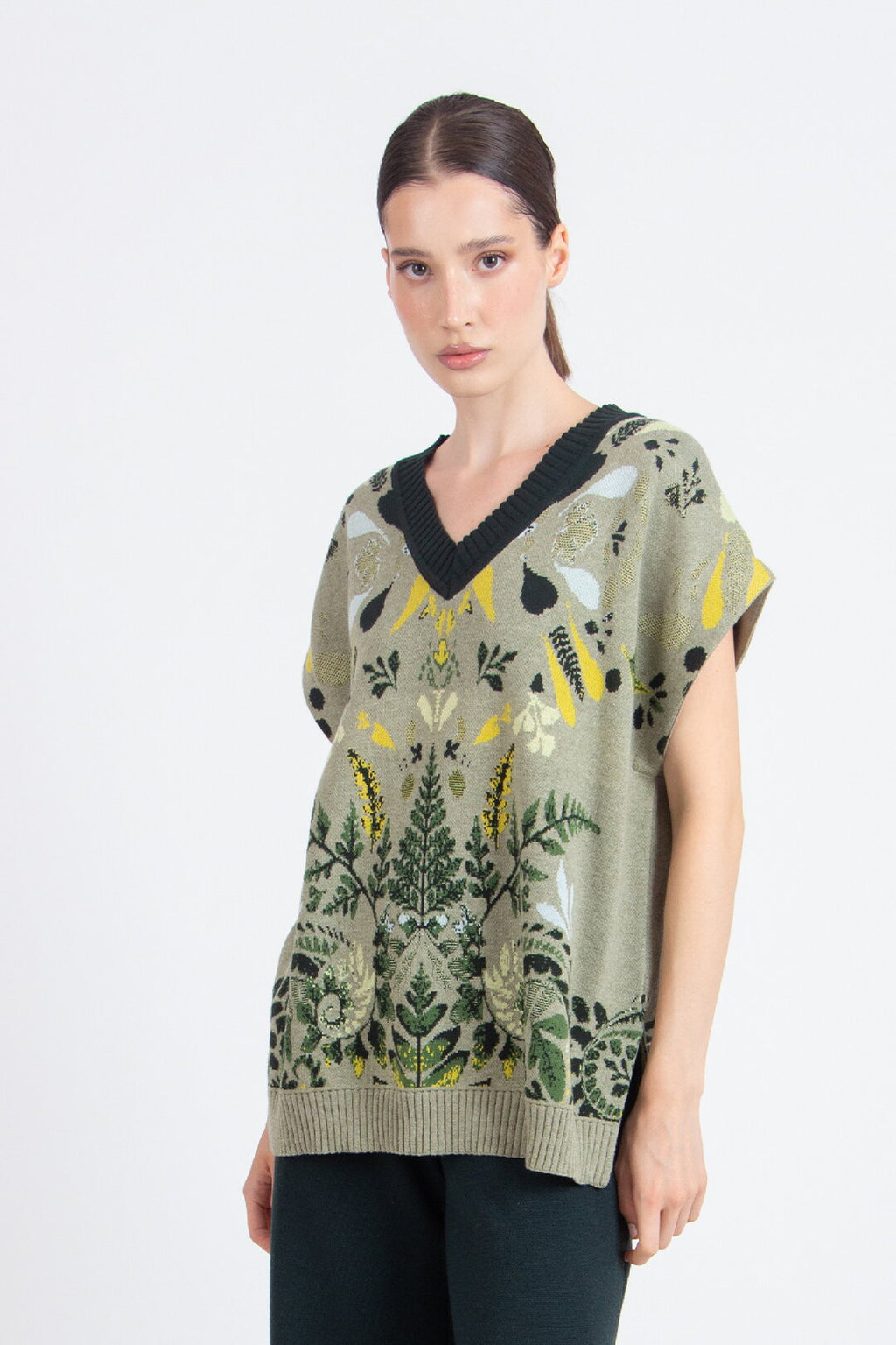 Sleeveless V-Neck Pullover, Plantopia Pattern Salvia