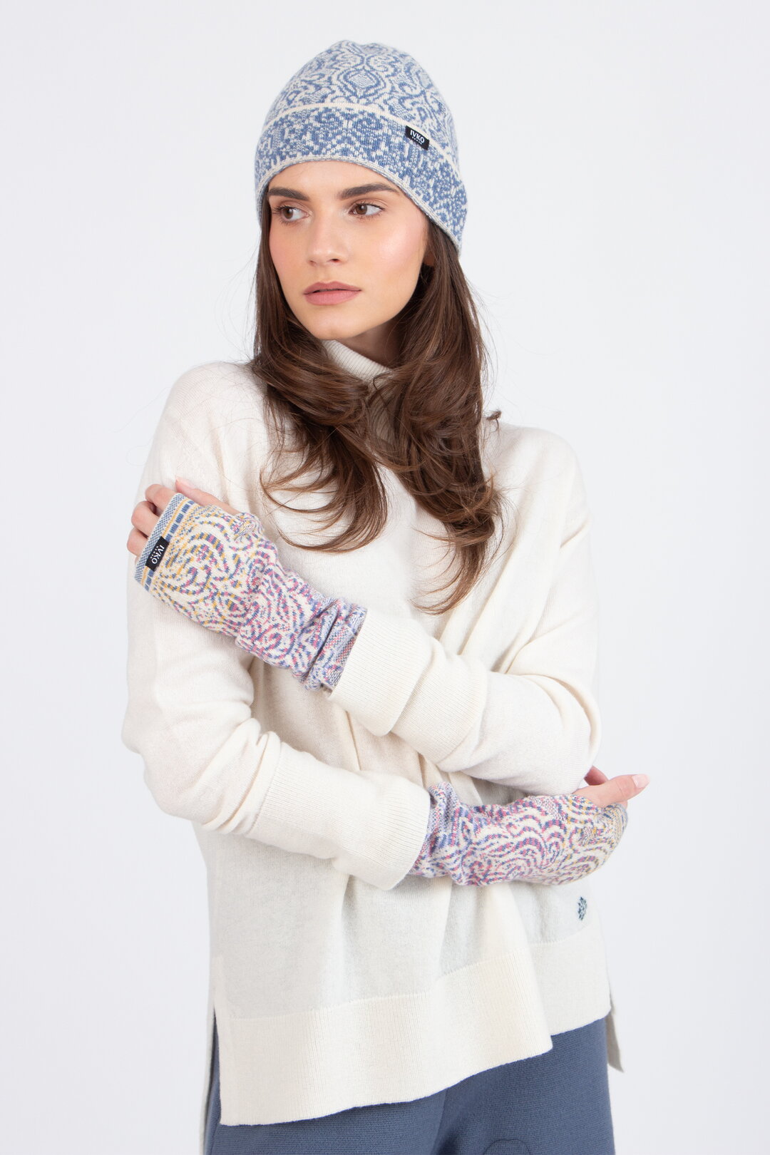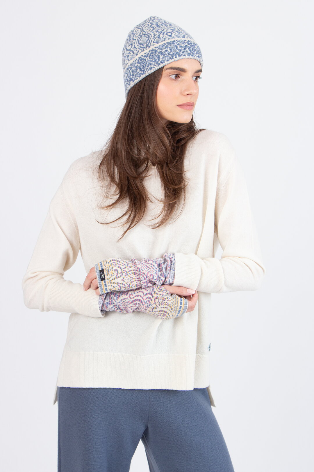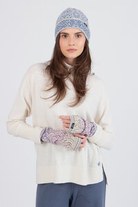 Wrist warmers in wool and viscose with an Ornament motif. The elastic knit and rich detailing make them both functional and decorative.